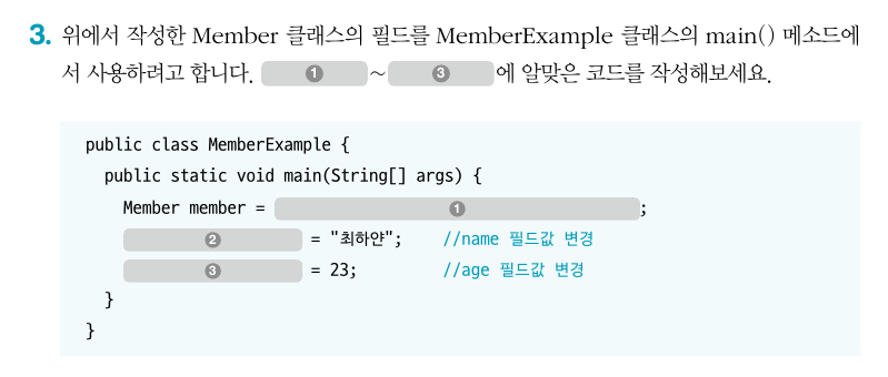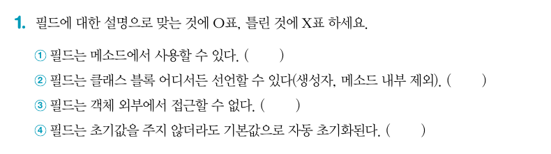 ③ X : 필드 사용은 변수와 동일한데, 차이점으로 변수는 자신이 선언된 생성자 또는 메소드 블록 내부에서만 사용할 수 있는 반면 필드는 생성자 선언과 메소드 선언의 앞, 뒤 어떤 곳에서도 선언이 가능하다.