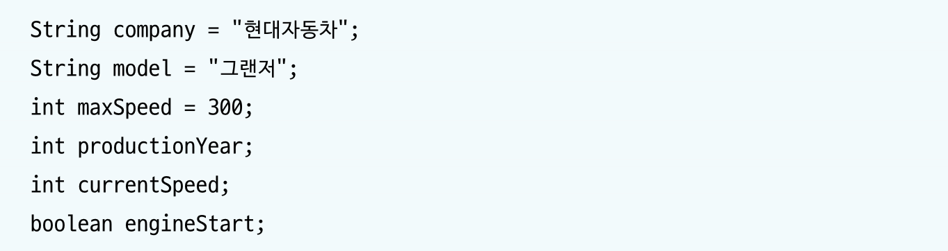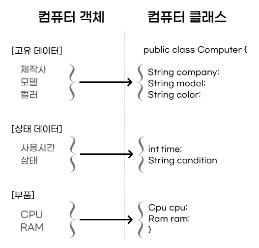 컴퓨터는 객체에는 고유데이터, 상태데이터, 부품이 있을 것이고 클래스는 아래와 같이 생성될 것이다.